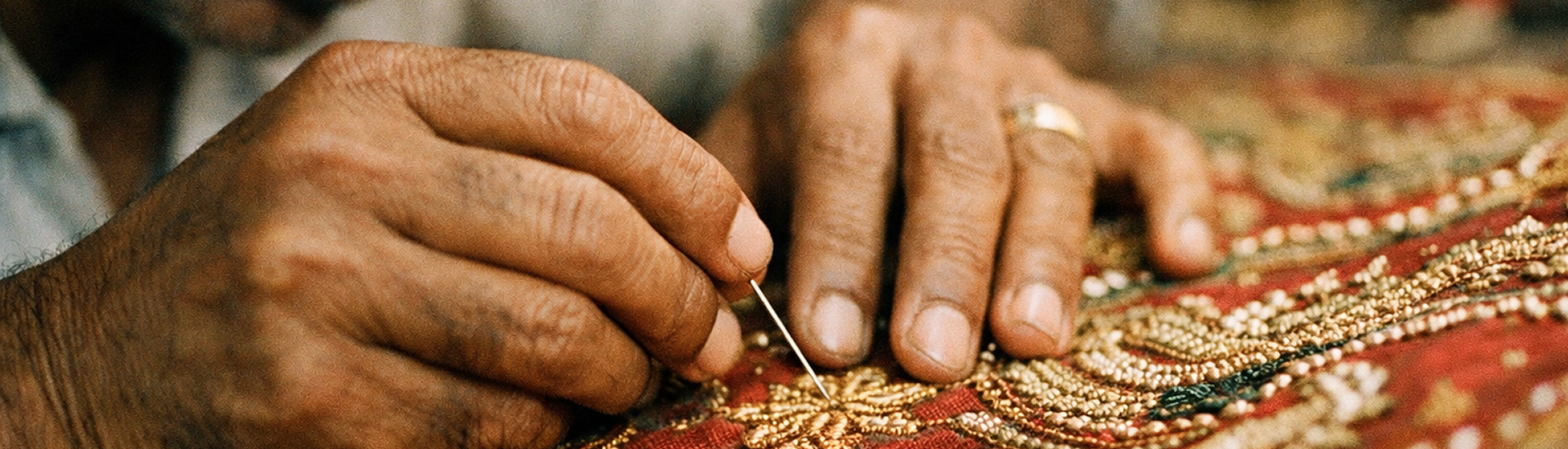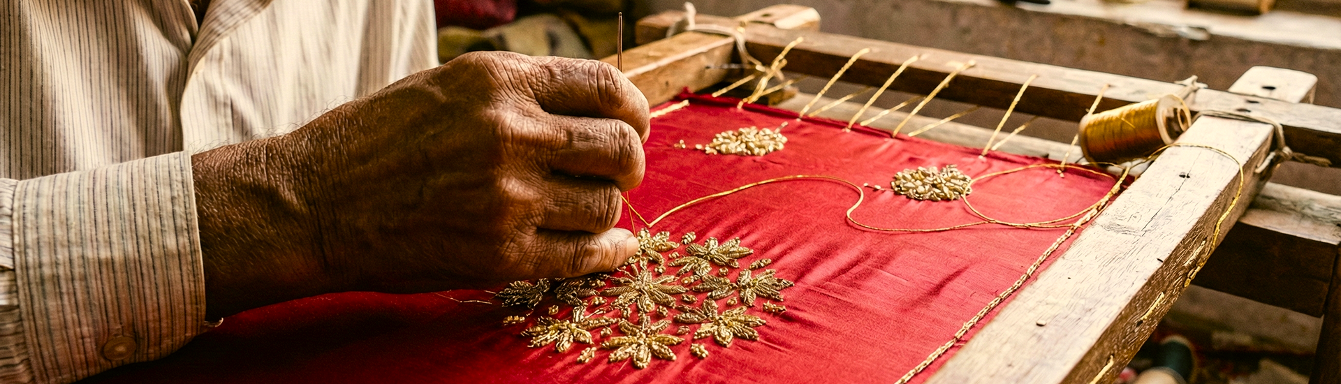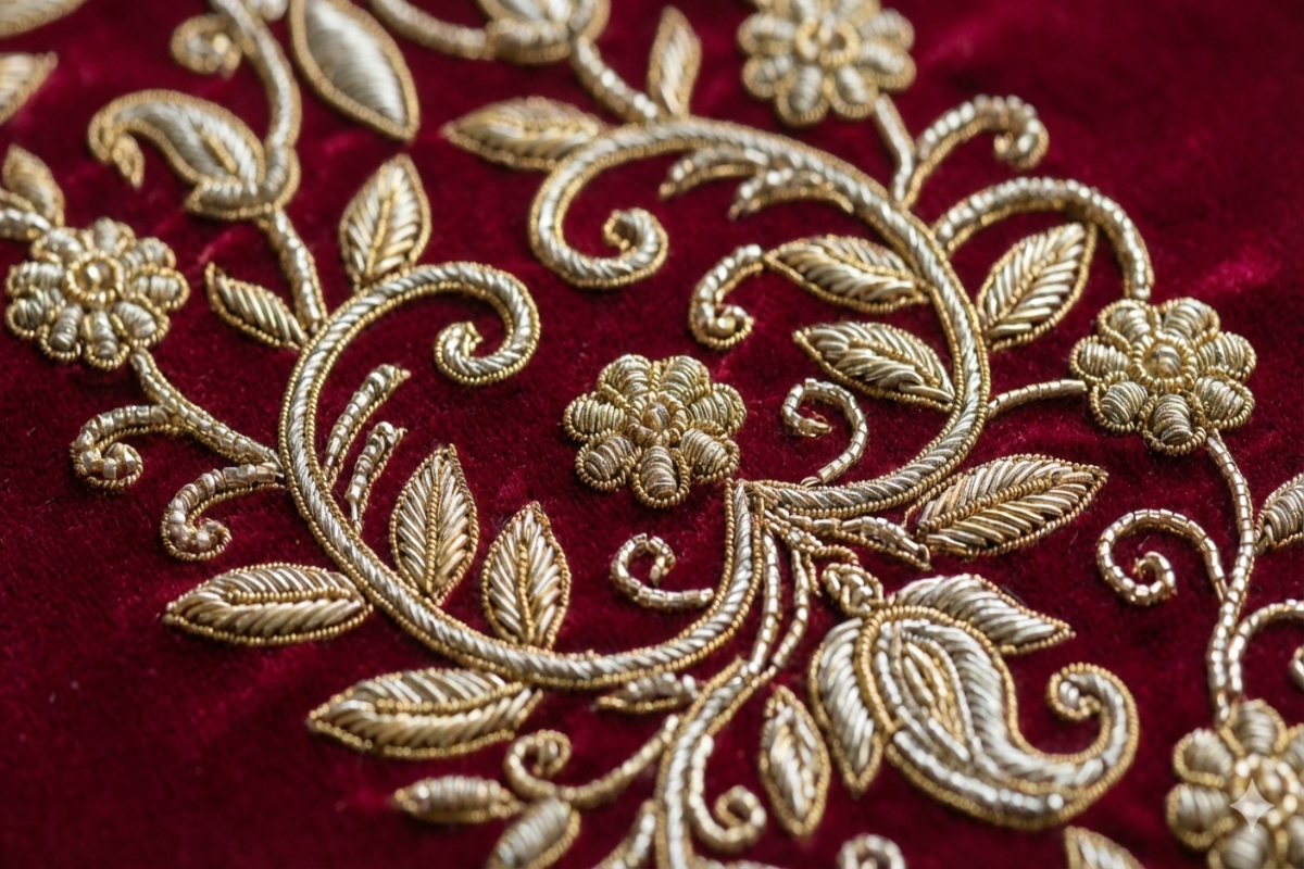 Zardozi is a traditional form of hand embroidery known for its richness and depth. Crafted using metallic threads, it creates raised, sculptural detailing on fabric. Historically associated with ceremonial wear, Zardozi brings a sense of gravitas and permanence. It’s craftsmanship rooted in patience, meant to endure rather than impress at first glance.