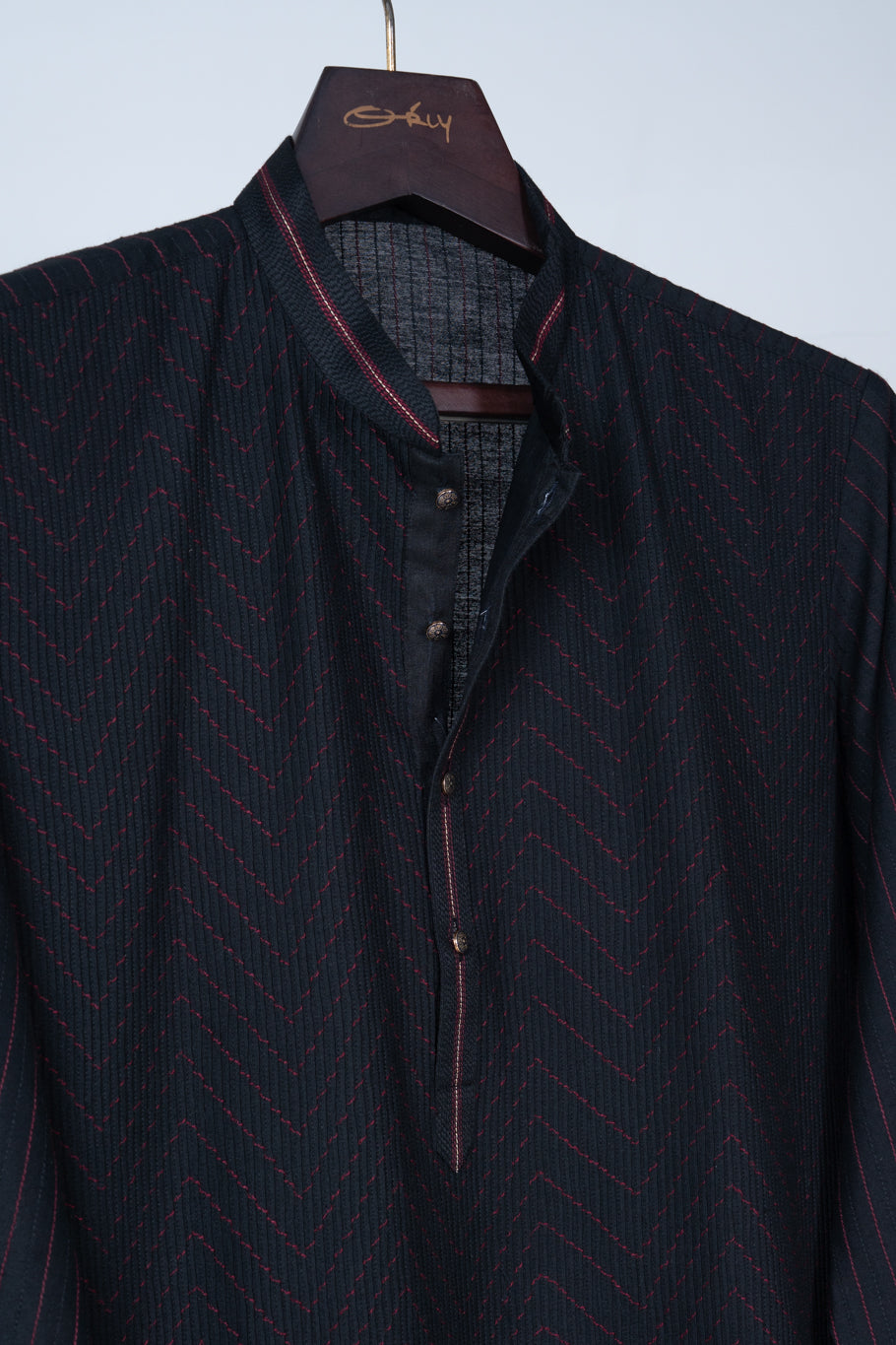 A black kurta featuring refined pintex work across the body, creating a subtle play of texture and depth without surface embellishment. Crafted in a lightweight cotton blend with a structured yet breathable feel, it is designed for evening wear and understated festive occasions.