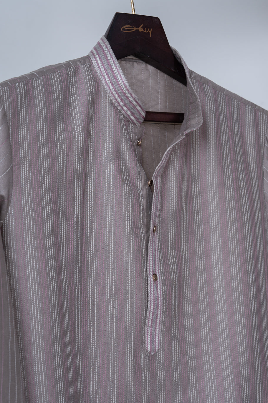 A mauve grey kurta featuring fine vertical woven stripes that lend texture and rhythm to the silhouette. Crafted in a lightweight cotton blend, it is designed for festive mornings and intimate cultural gatherings where comfort and restraint take precedence.